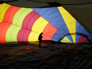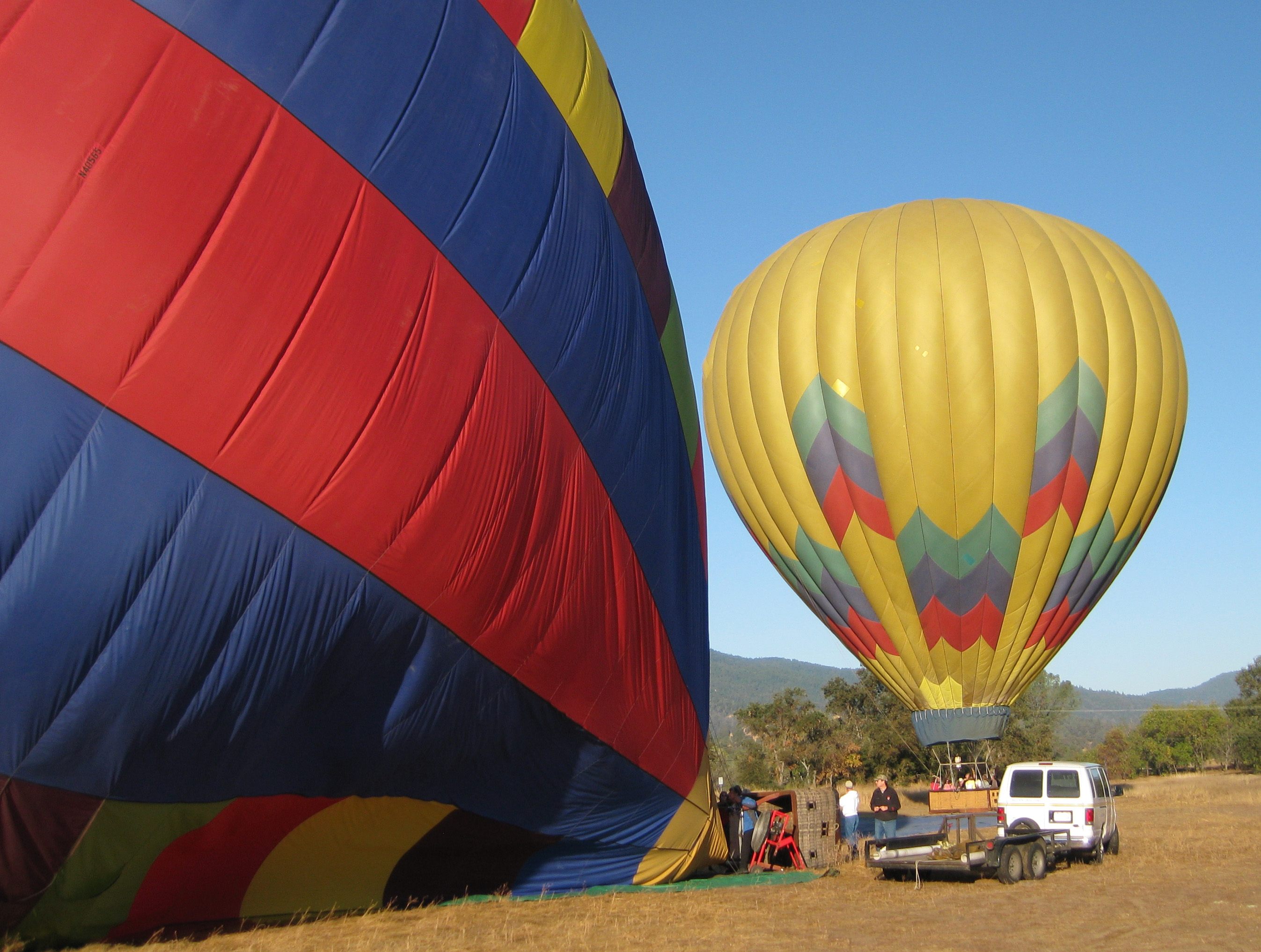 So one mid-October morning, we were up at 5:30 to meet the crew and other passengers for a winding drive of 45 minutes or so in the dark to get out of the fog. Just after sunrise, we came to a field where another group was inflating their balloon. “Do you know why we take off early?” Scott, the pilot, asked. No one did. “So we’re done by the time the wineries open, of course.”