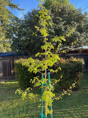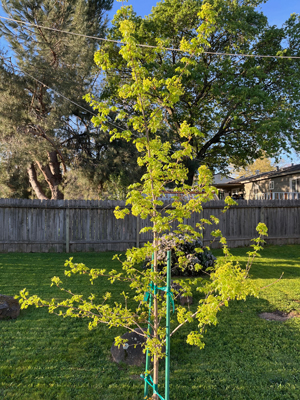 A year ago, a long-suffering linden tree in the back yard died. Due to our poor soil, a tree service recommended replacing it with maples. Two in the front yard, planted a decade ago, are thriving, so we picked out two saplings at a large local nursery and planted them in the back. Unfortunately, the man who sold us the trees also recommended what proved to be a large overdose of starter fertilizer. As a result, from May through late October, the leaves that appeared would soon burn. All through that first season, the trees looked like they were dying.