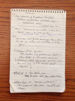 A few days ago, looking for a piece of scratch paper, I picked up a 5″ x 8″ spiral notebook from a desk in the back room. I flipped it open to some curious notes on fairytales – and I cannot remember where they came from. Not from any book I possess, nor from any lecture I remember. Did they come from a blog post? And if so, why did I take the time to jot down two pages of notes without bookmarking the post?